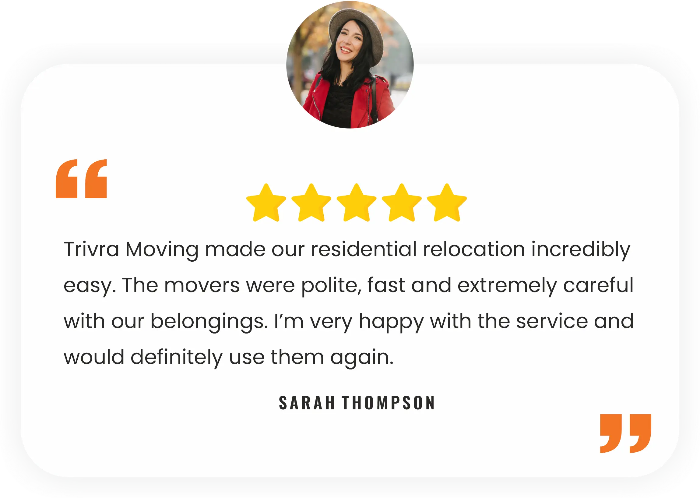 Your satisfaction matters to us. At Trivra Moving, we take pride in every move—household, commercial, furniture, or long distance. Our team ensures safe handling, timely delivery, and complete care from start to finish. We value your Google reviews and strive to provide a five-star experience every time.
